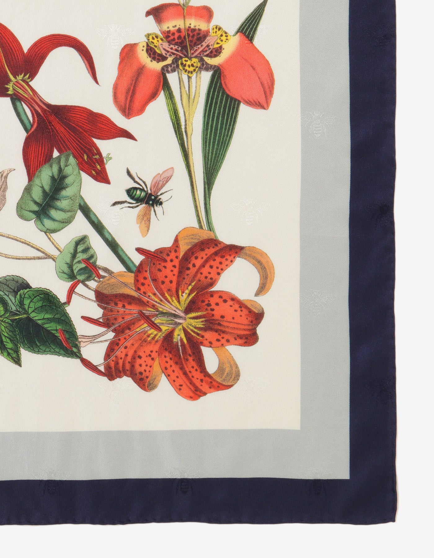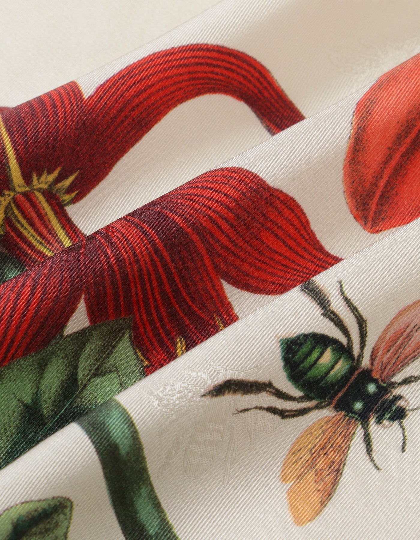 • A silk fabric with a woven pattern is printed using traditional scarf manufacturing techniques.