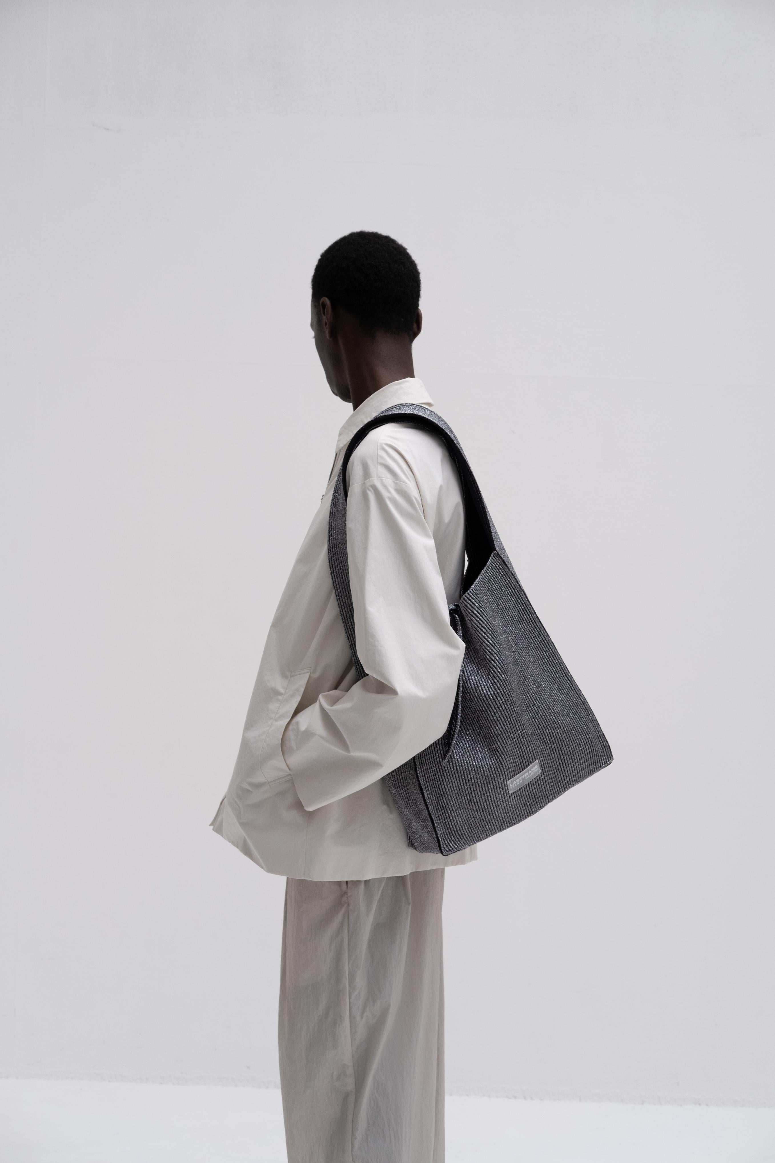 タスキのように太幅のショルダーが特徴のリバーシブル仕様のニットバッグ。